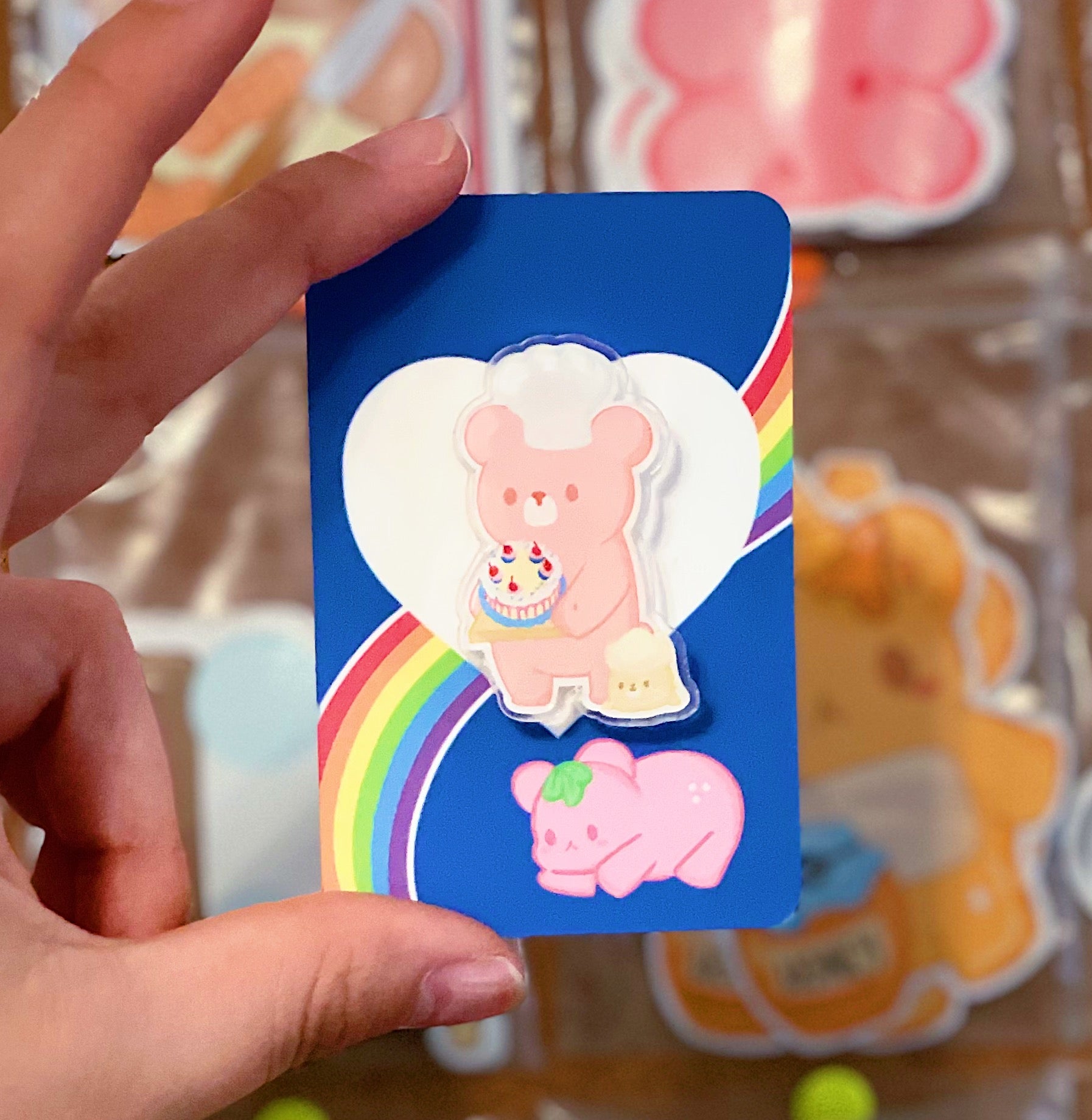 A cute acrylic baker bear! Holding a cute cake with his buddy, the flour sack.