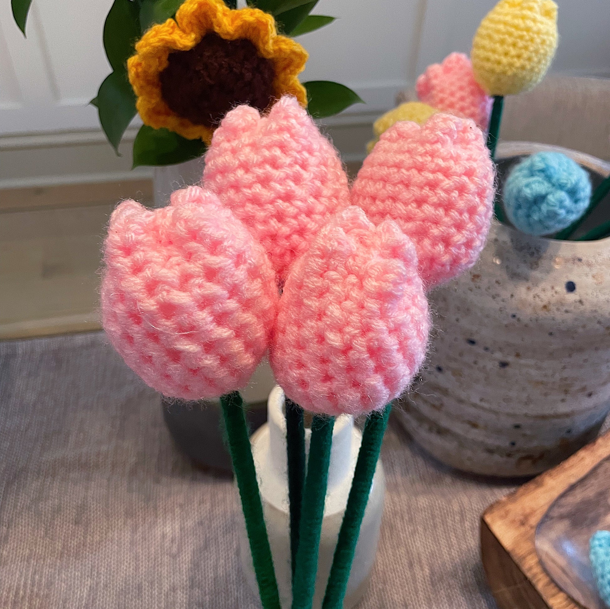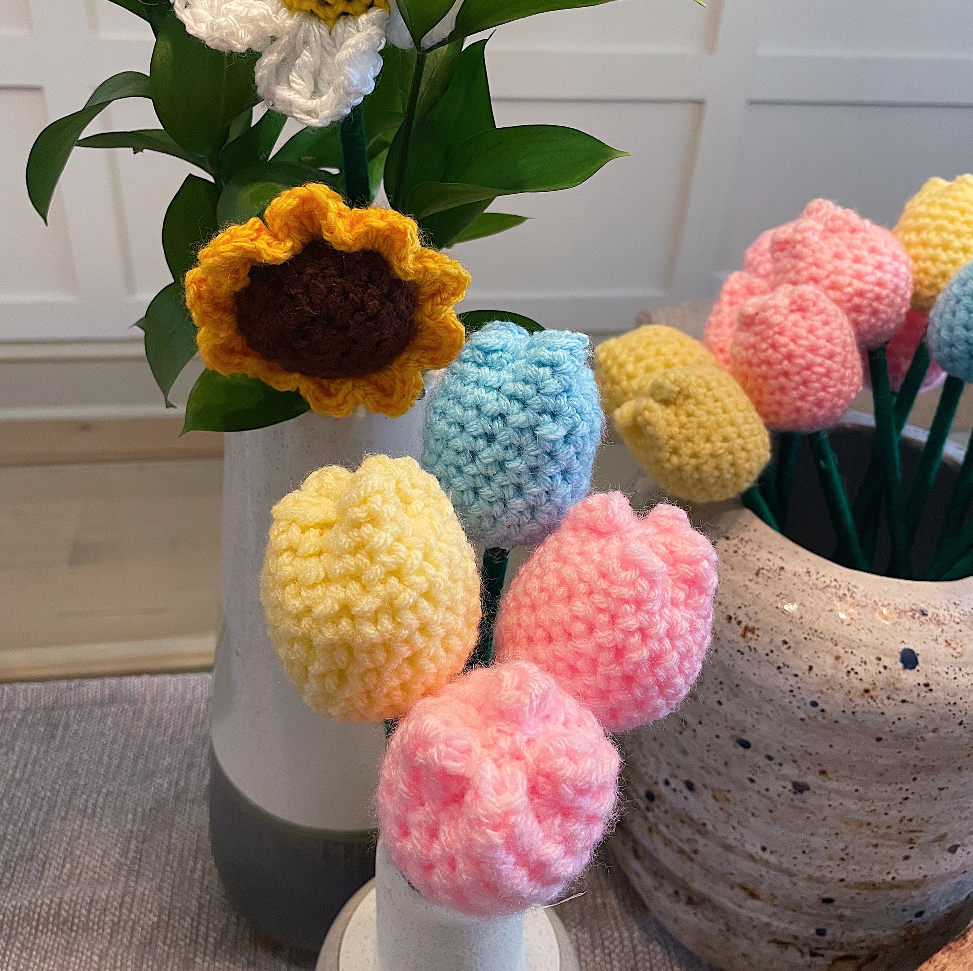 Tulip: available in multiple colors. From vibrant blooms to delicate blossoms, our crochet flowers bring a touch of elegance and charm to any project or space.