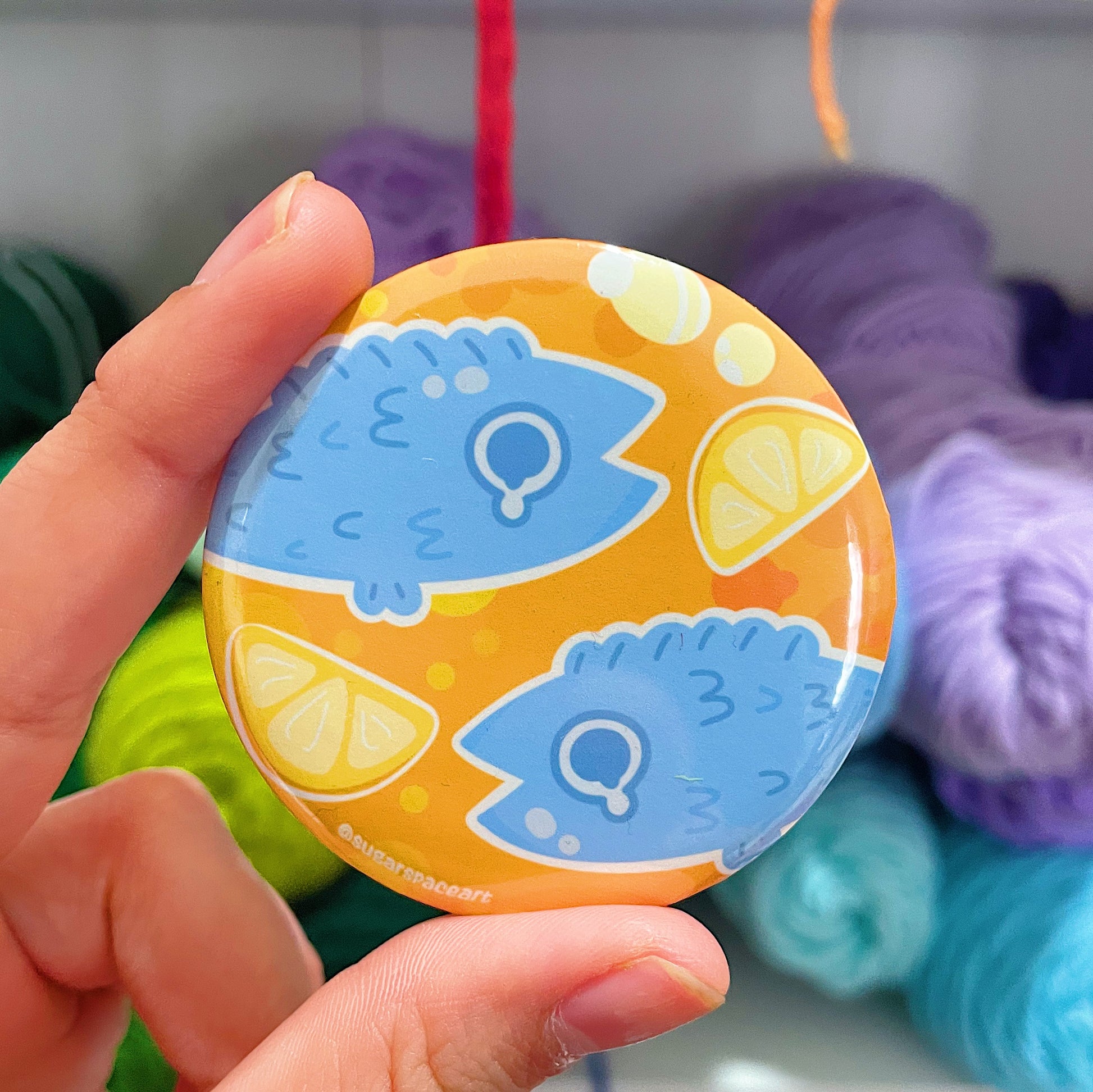 Just some fishies swimming in a colorful and sparkly pool of orange juice! 2.5in button. 100% handmade
