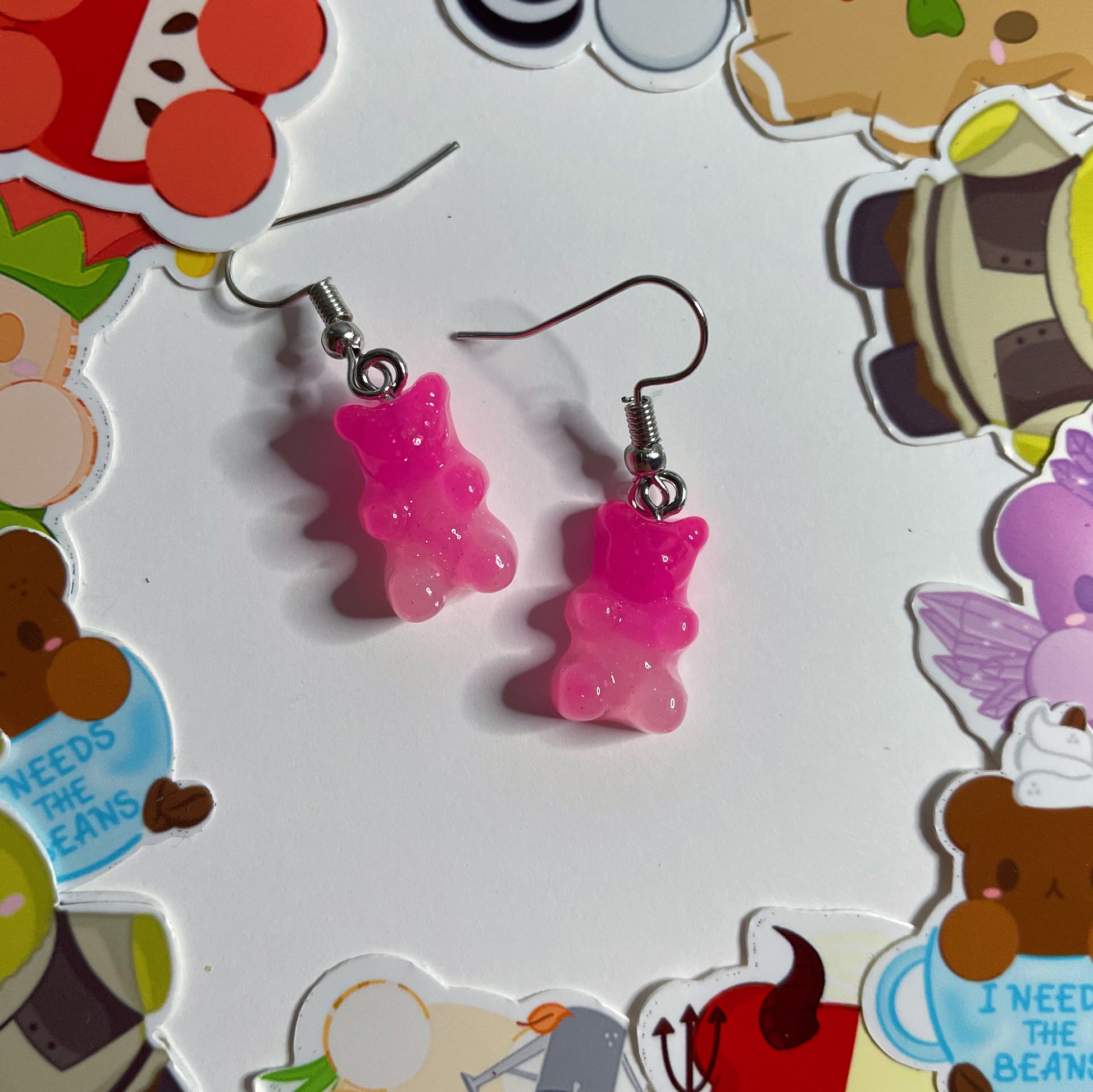 Dangly light and dark pink gummy bear earrings.